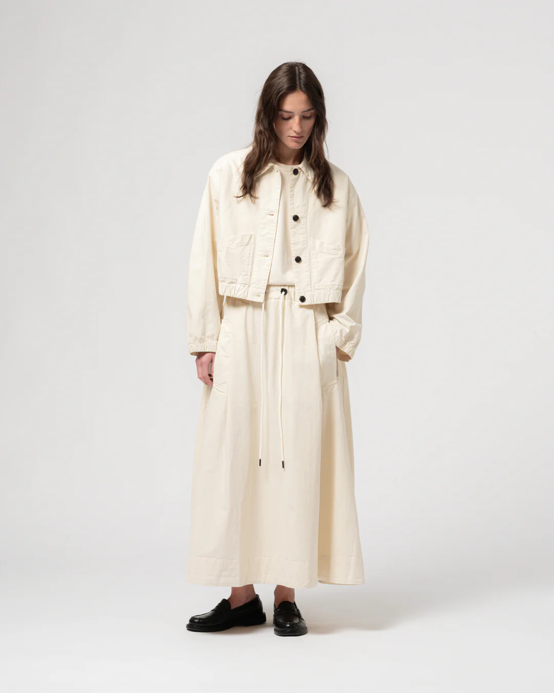 This cropped overshirt is a perfect blend of relaxed style and functionality. Made from a cotton-linen blend, it offers a light, airy feel. The shirt features two front pockets for a practical touch, along with five buttons down the front. The cropped cut gives it a modern, laid-back silhouette, making it ideal for layering over your favorite top or wearing as a standalone piece.
