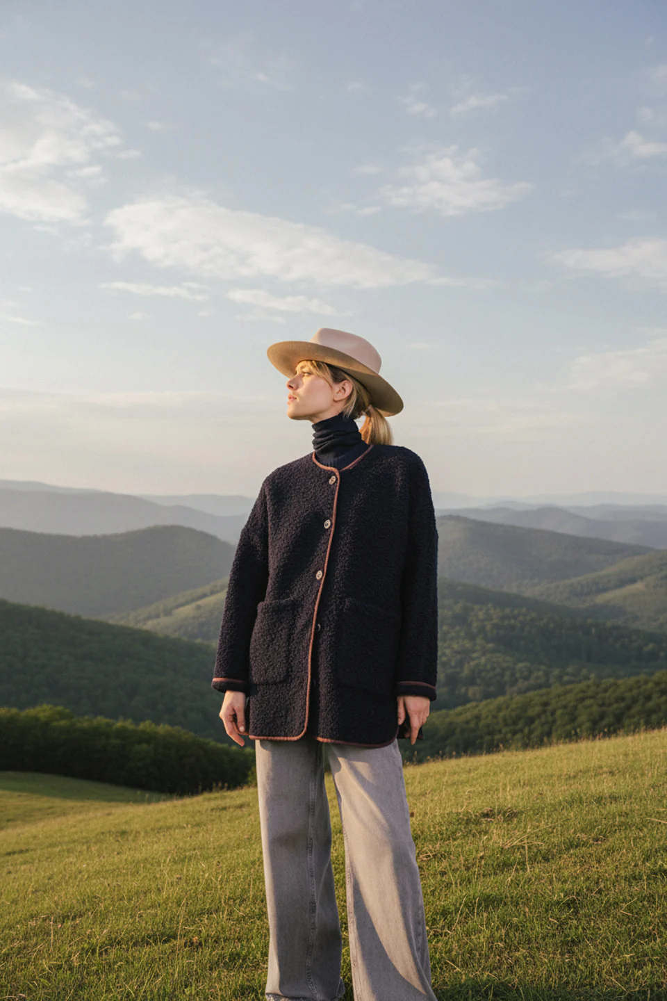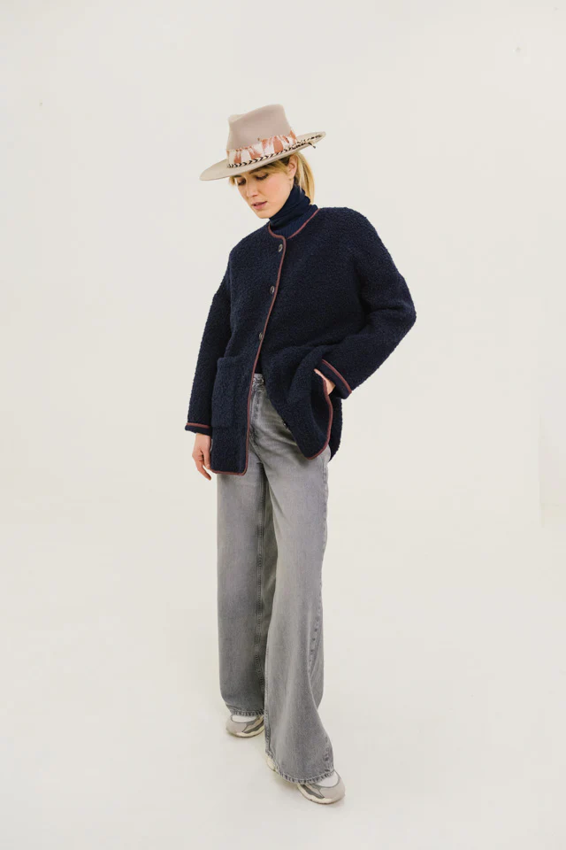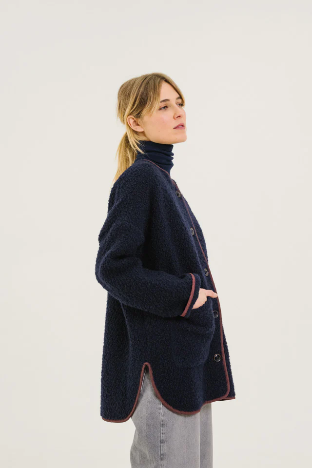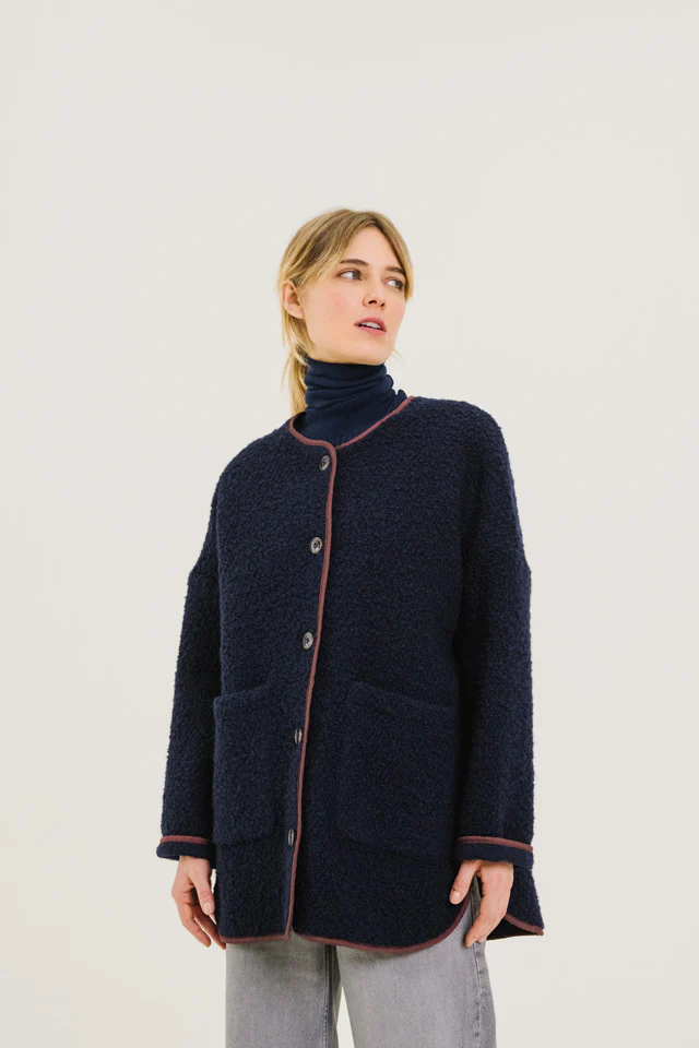 Mid-length jacket in navy bouclé wool, lined at the front and back, with low armholes and two patch pockets at the front.