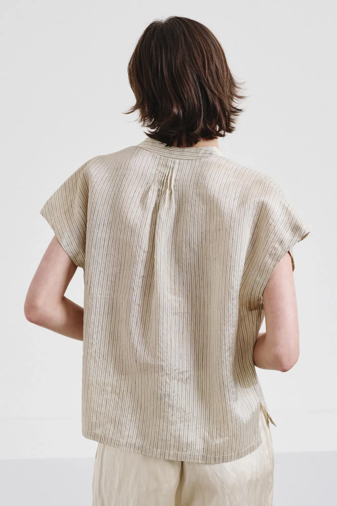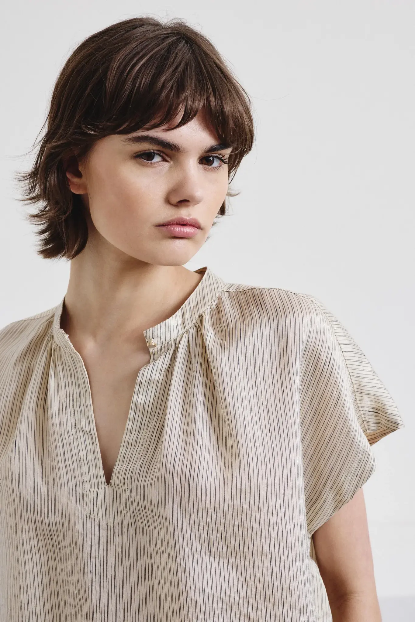 A lively and bold spirit combines with precious details in the striped shantung top in viscose, linen, and silk. The fluid, soft lines of the piece enhance the refined asymmetrical striped pattern, while the gathered trims add a feminine touch, enriching the collar and the keyhole neckline.