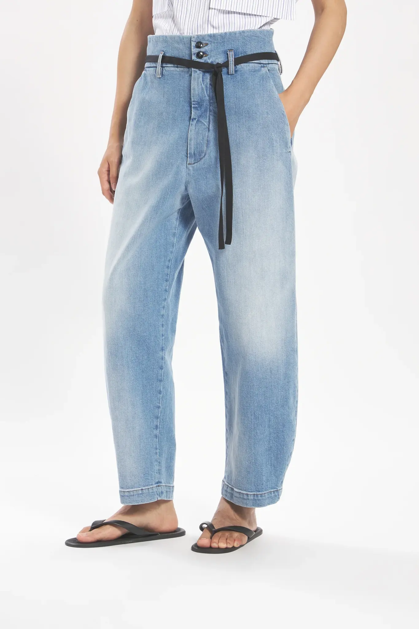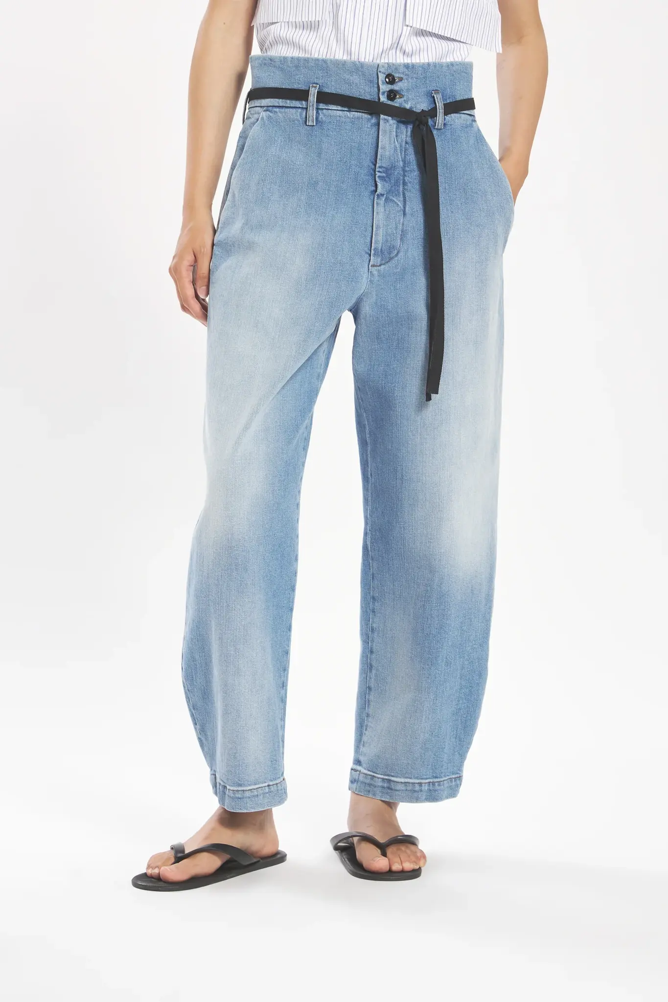 These high-waisted, curved-leg trousers combine comfort with utility. Made from washed cotton denim, they offer a durable yet softened feel, ideal for everyday wear. Composition: 99% Cotton, 1% Elastane