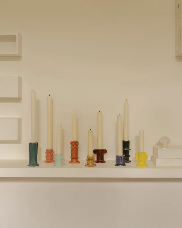 A playful set of ceramic candle holders from the Molly collection, designed by Marie Michielssen. Each piece features a distinct shape and a colorful glazed finish. Together, they form a vibrant trio of candle holders that bring character and creativity to any interior.
