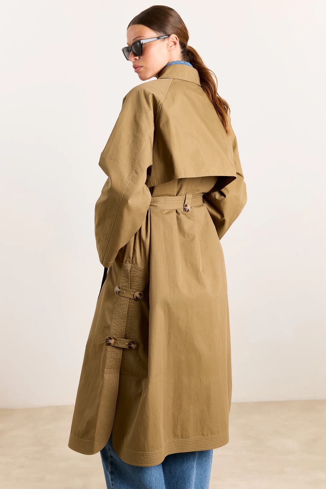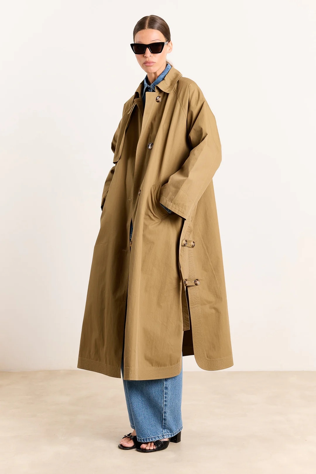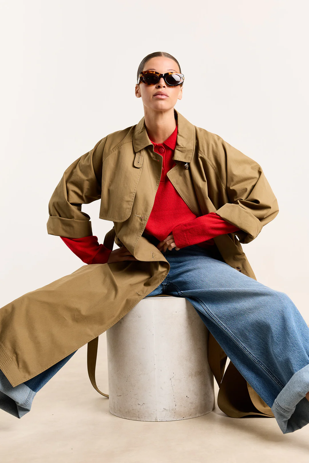 Christel is cut from a cotton-nylon blend fabric. Designed with a relaxed silhouette and dropped shoulders, it brings ease to the traditional structure. Classic trench details, like the storm flap, back vent, and double-button side tabs, are present but softened with updates. The waist belt allows for adjustable cinching, while side seam pockets add functionality. Finished with horn-effect buttons and clean topstitching. Model is 175 cm and wears size XS/S.