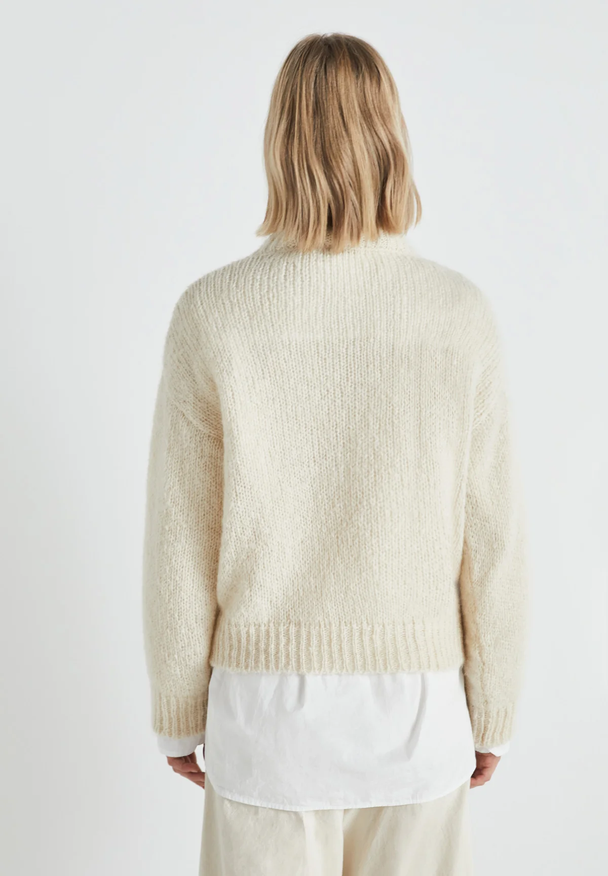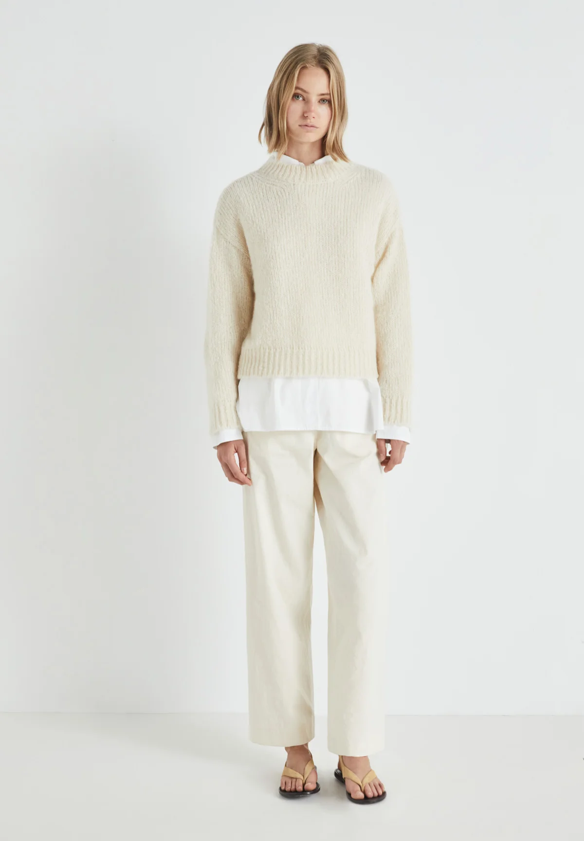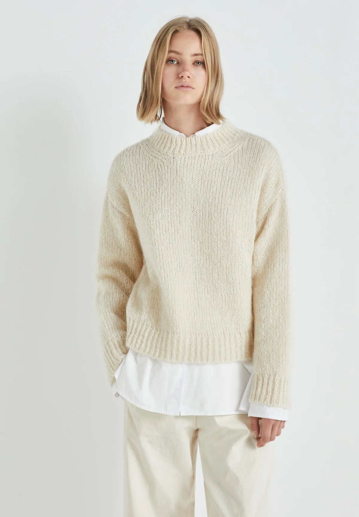 Crew neck, long sleeve, ribbed neckline, cuffs and hem.