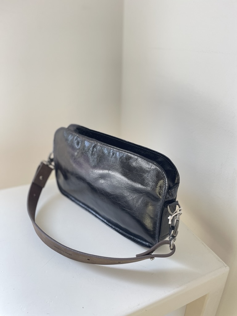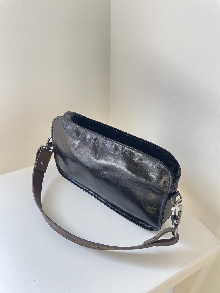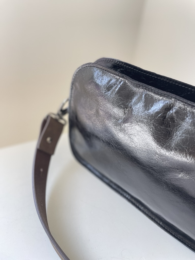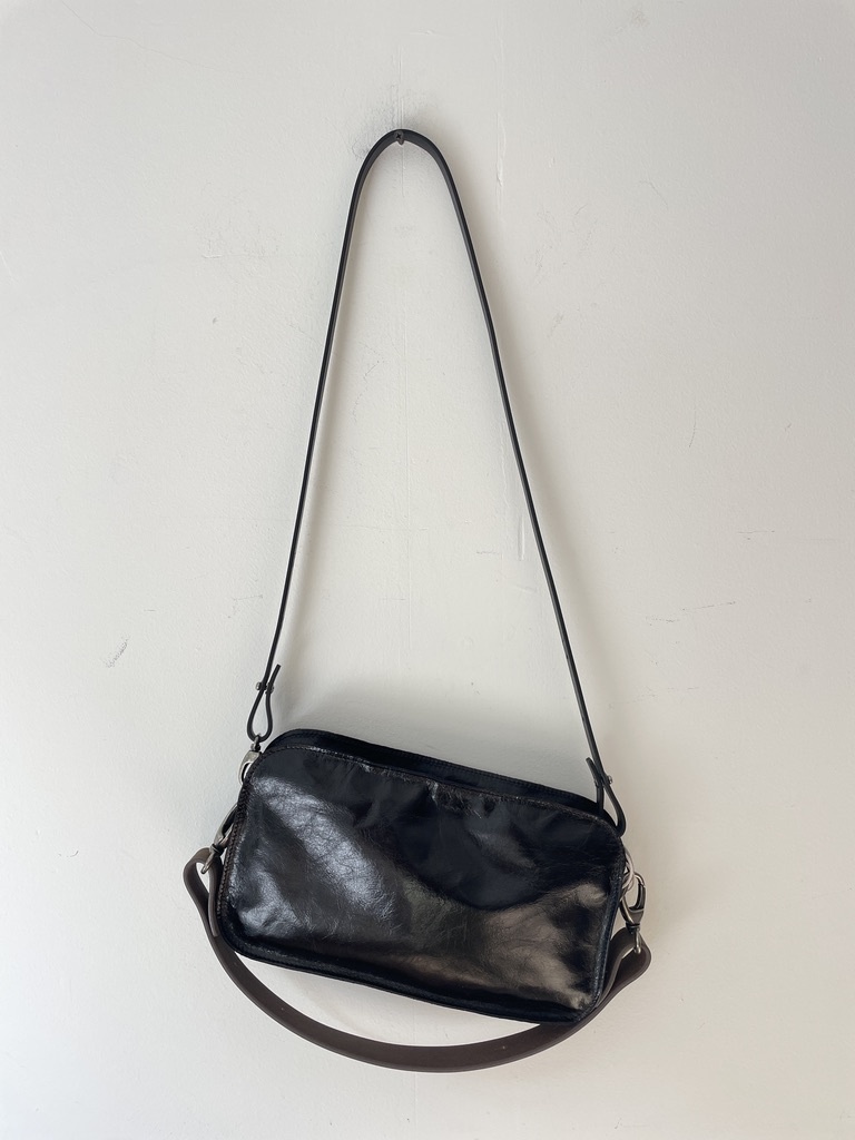 This compact yet spacious handbag is small but very practical. The long strap can be delivered in 100cm or 125cm, that the depends on how you prefer wearing your bag. Model wears it with length 100cm.