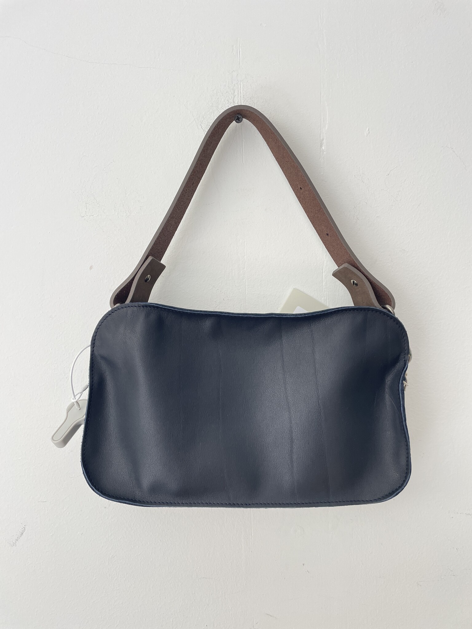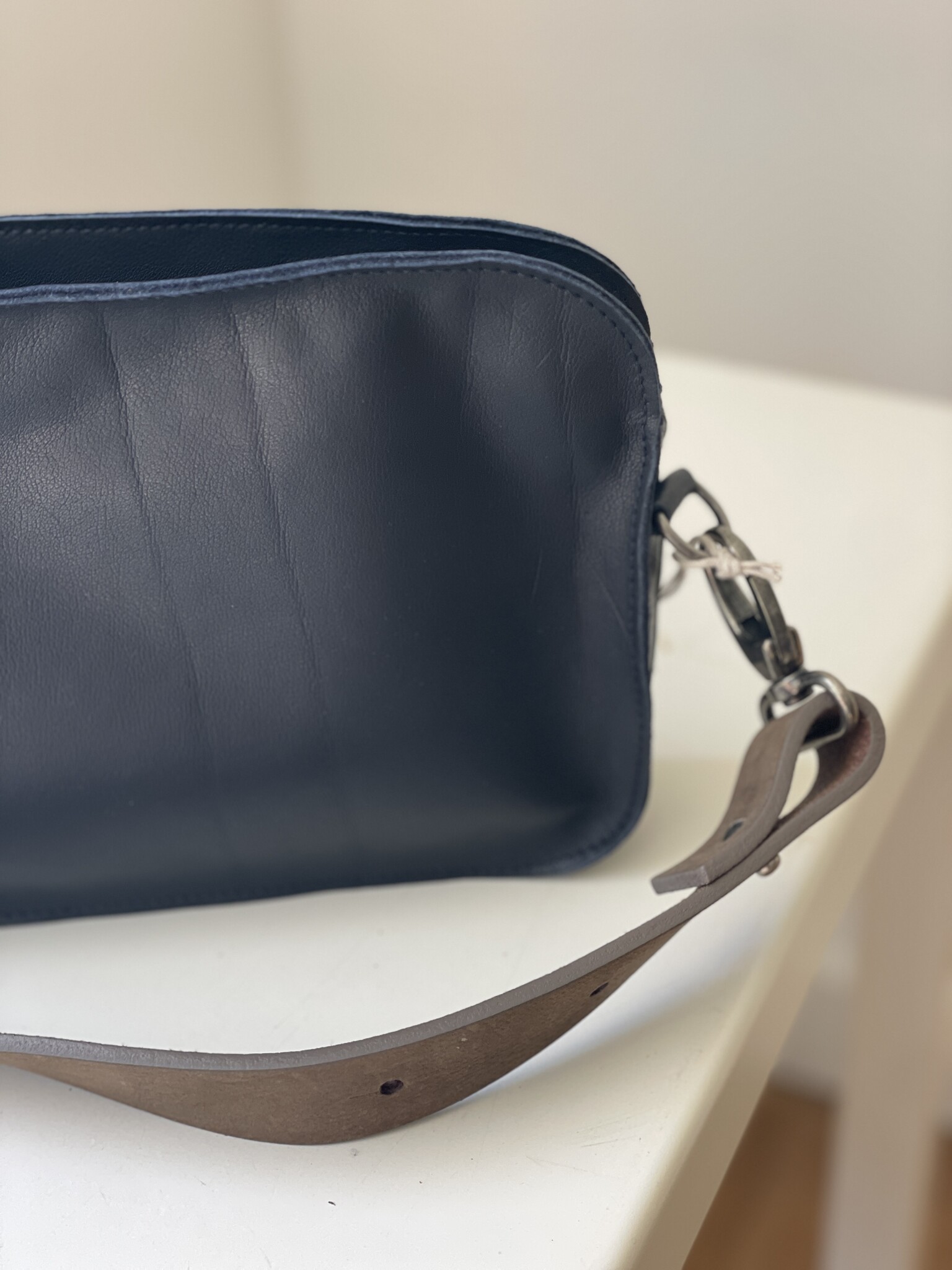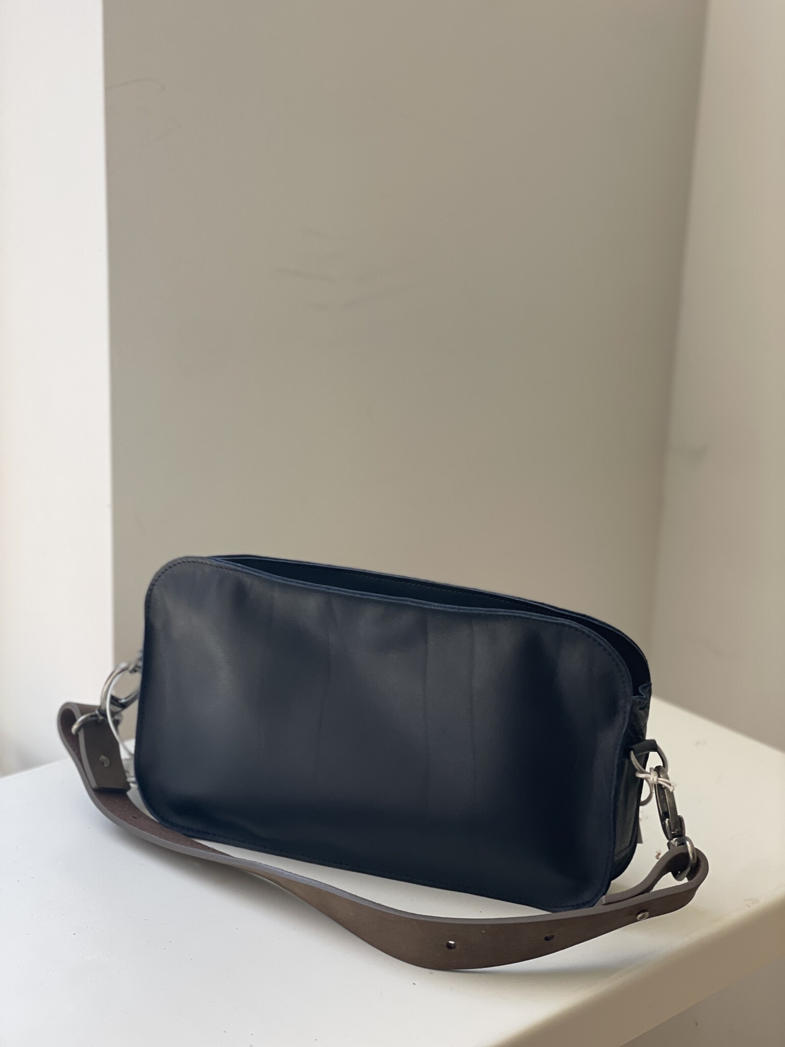 This compact yet spacious handbag is small but very practical. The long strap can be delivered in 100cm or 125cm, that the depends on how you prefer wearing your bag. Model wears it with length 100cm.