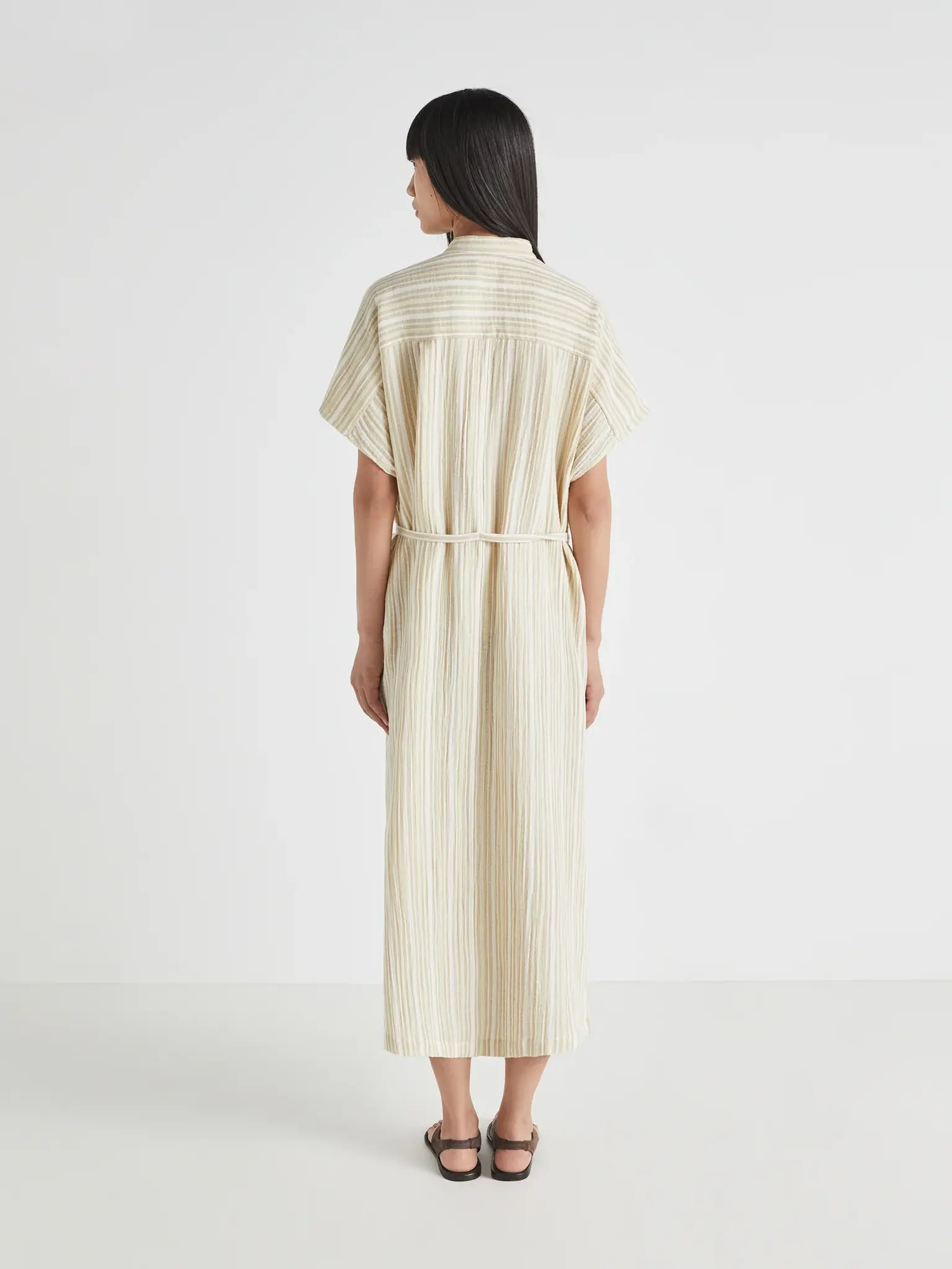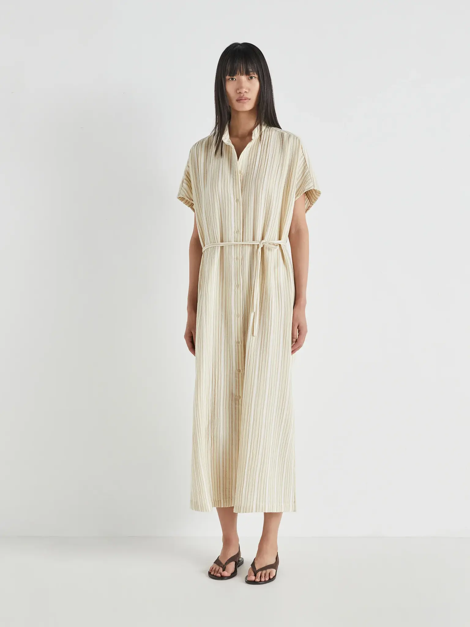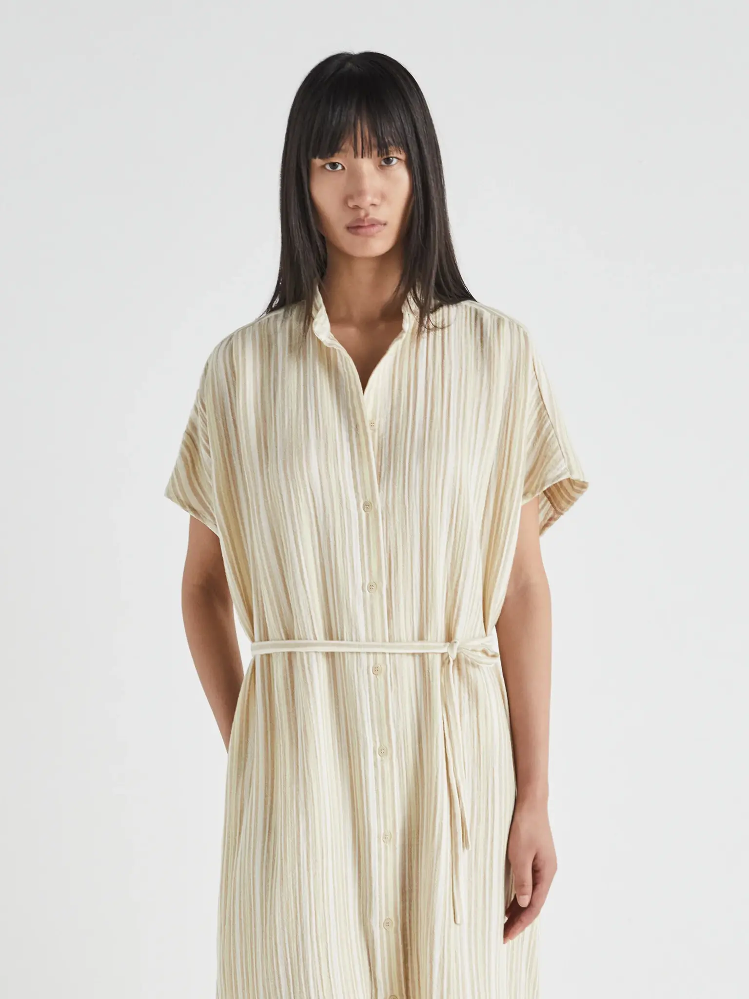 Crew neck, front buttoning, belt detail