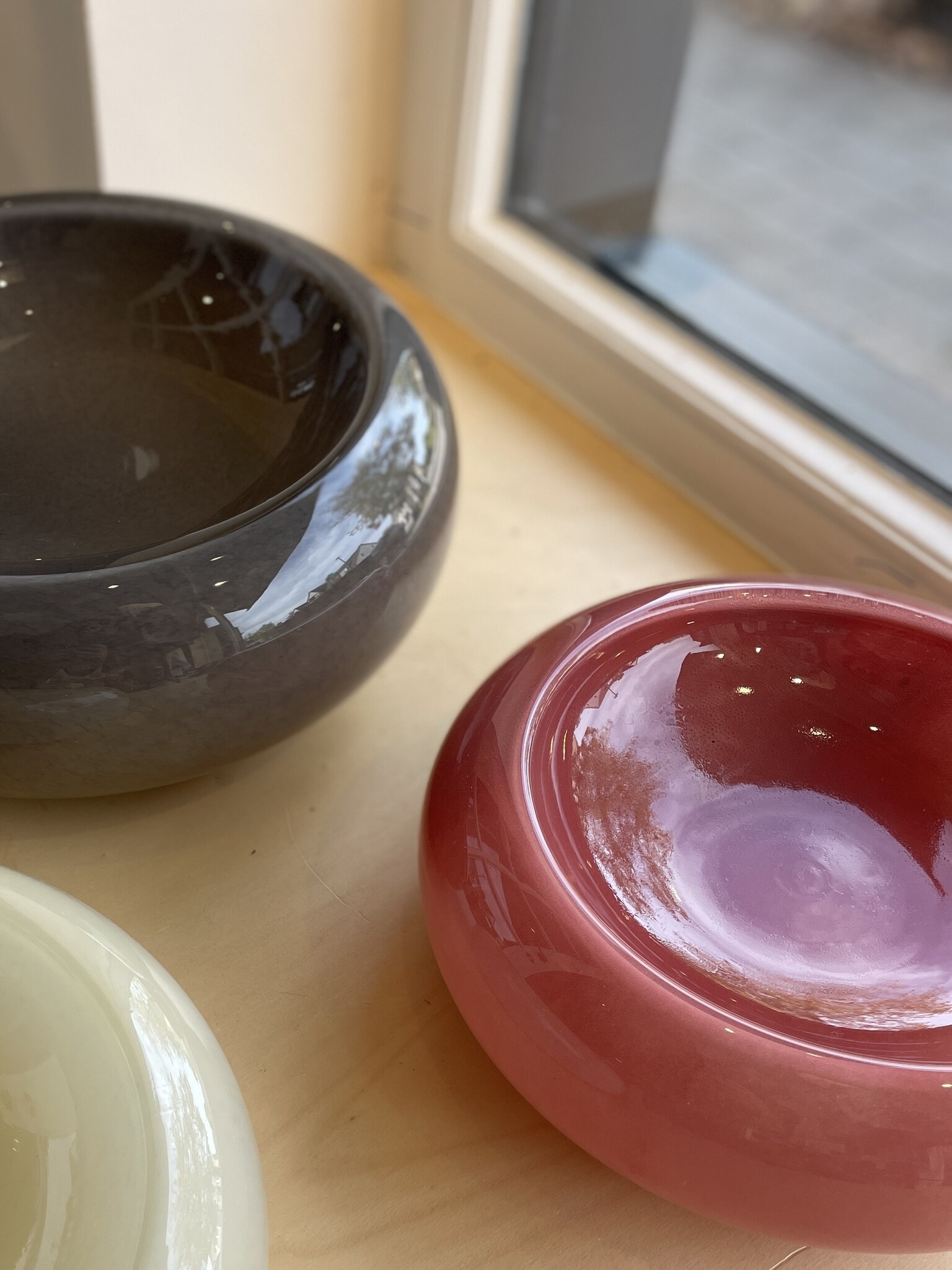This glass bowl, features a maroon hue inspired by 1950s simplicity and vibrant colors. Ideal for storing small items or as a standalone sculpture, it offers versatility with various colors and heights available.