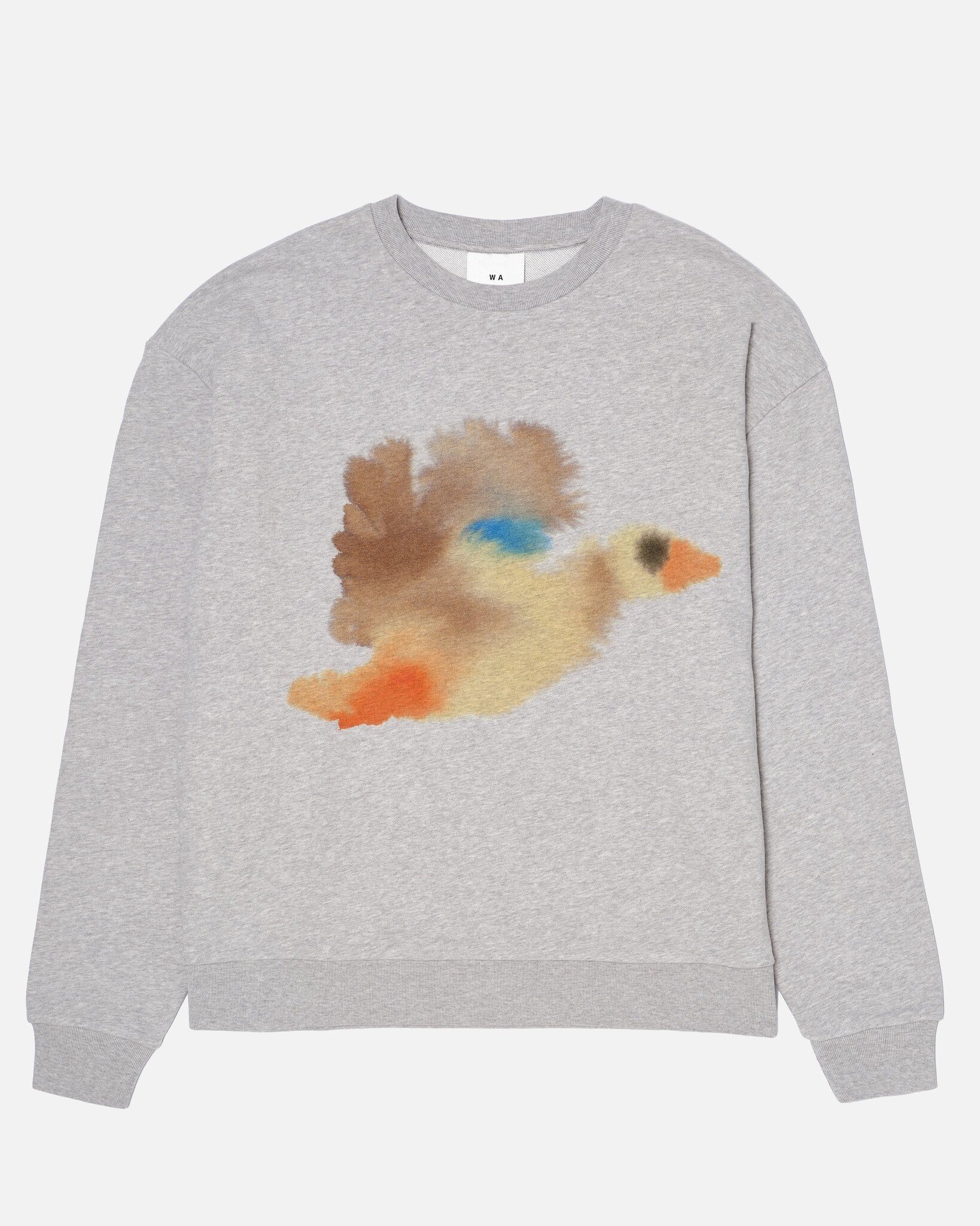 A heather grey unisex sweatshirt featuring a print of a Goose on the front. The fabric used to make this sweatshirt is certified by GOTS.