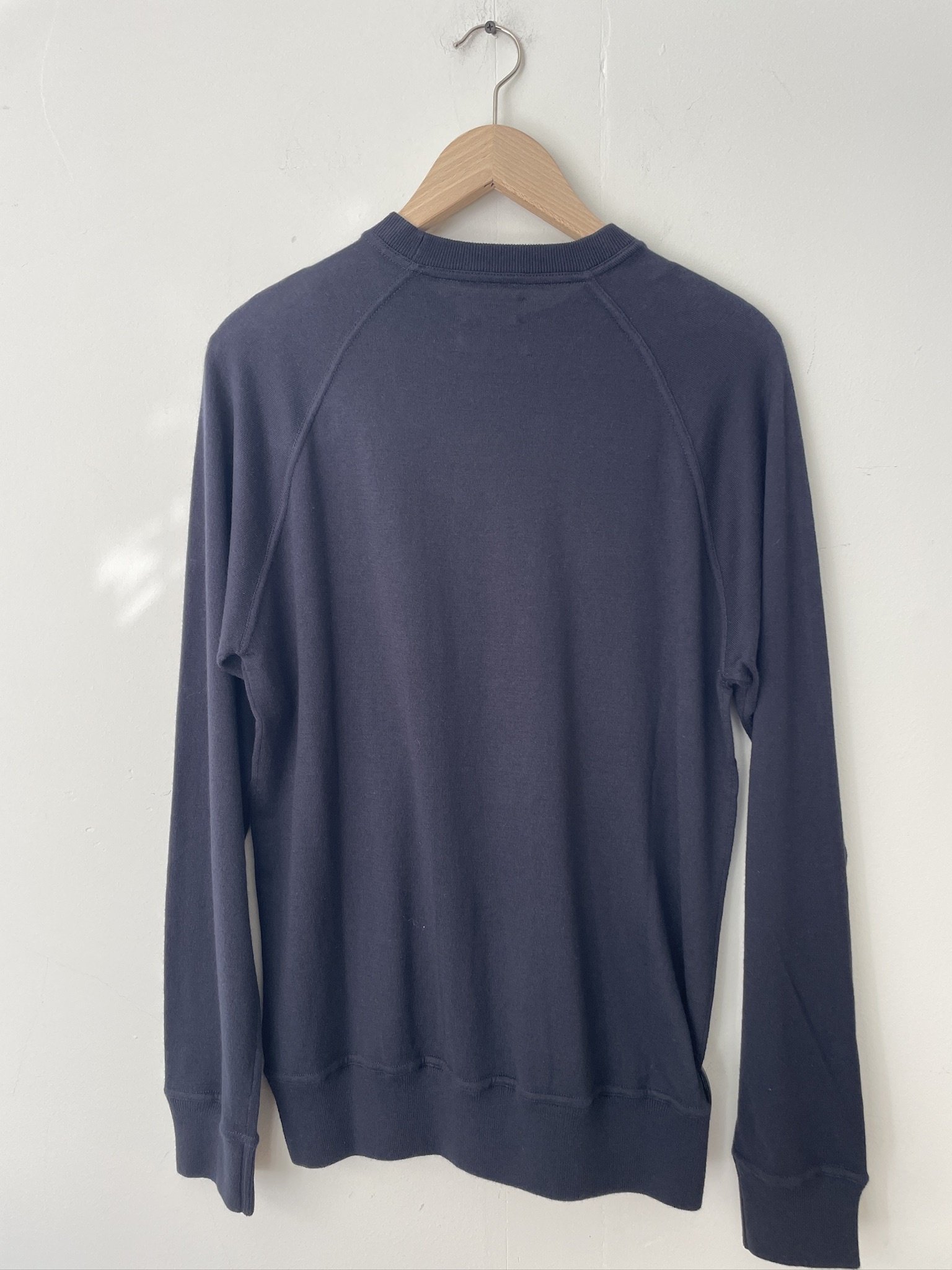 Lightweight men's sweater with long raglan sleeves and a crew neck. Raised stitching and ribbed trim at the neckline, cuffs, and waist.