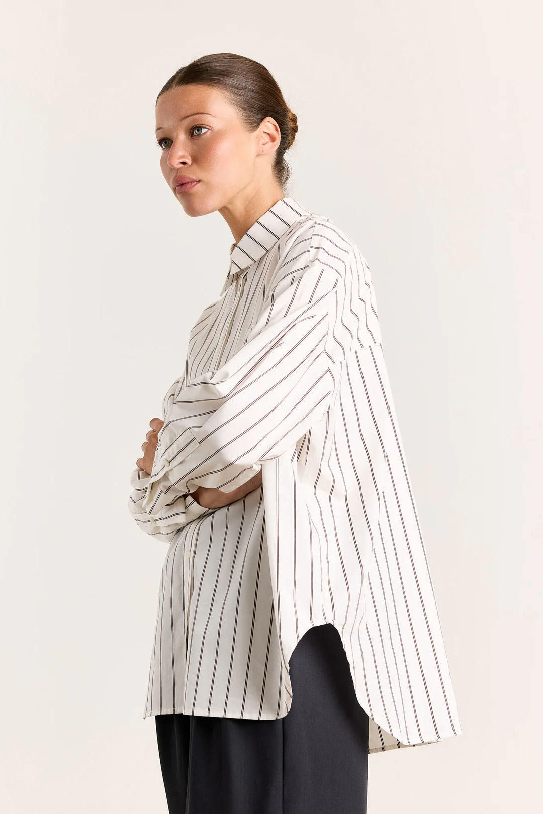 Laura is crafted from a 100% cotton. This oversized shirt with a relaxed silhouette features long sleeves with buttoned cuffs and a curved high-low hem. Full front button closure. Model is 175 cm and wears size XS/S.