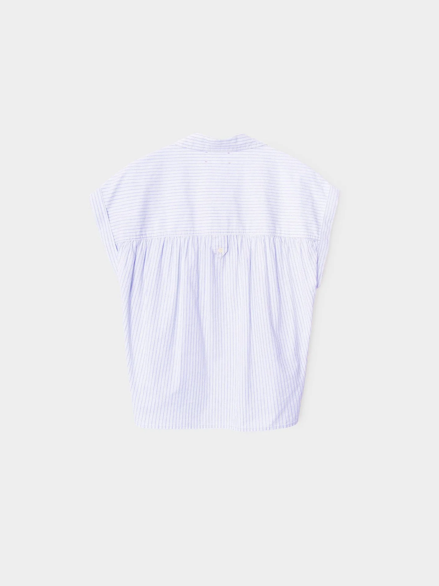 This easy button-front shirt features a left chest pocket, cap sleeves, and softly shirred shoulders and back yoke finished with a button-tab detail.