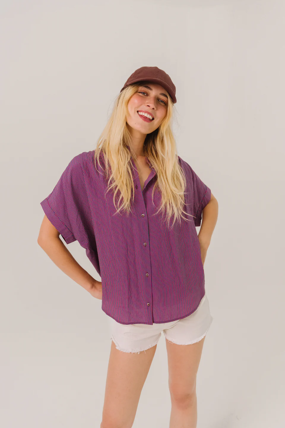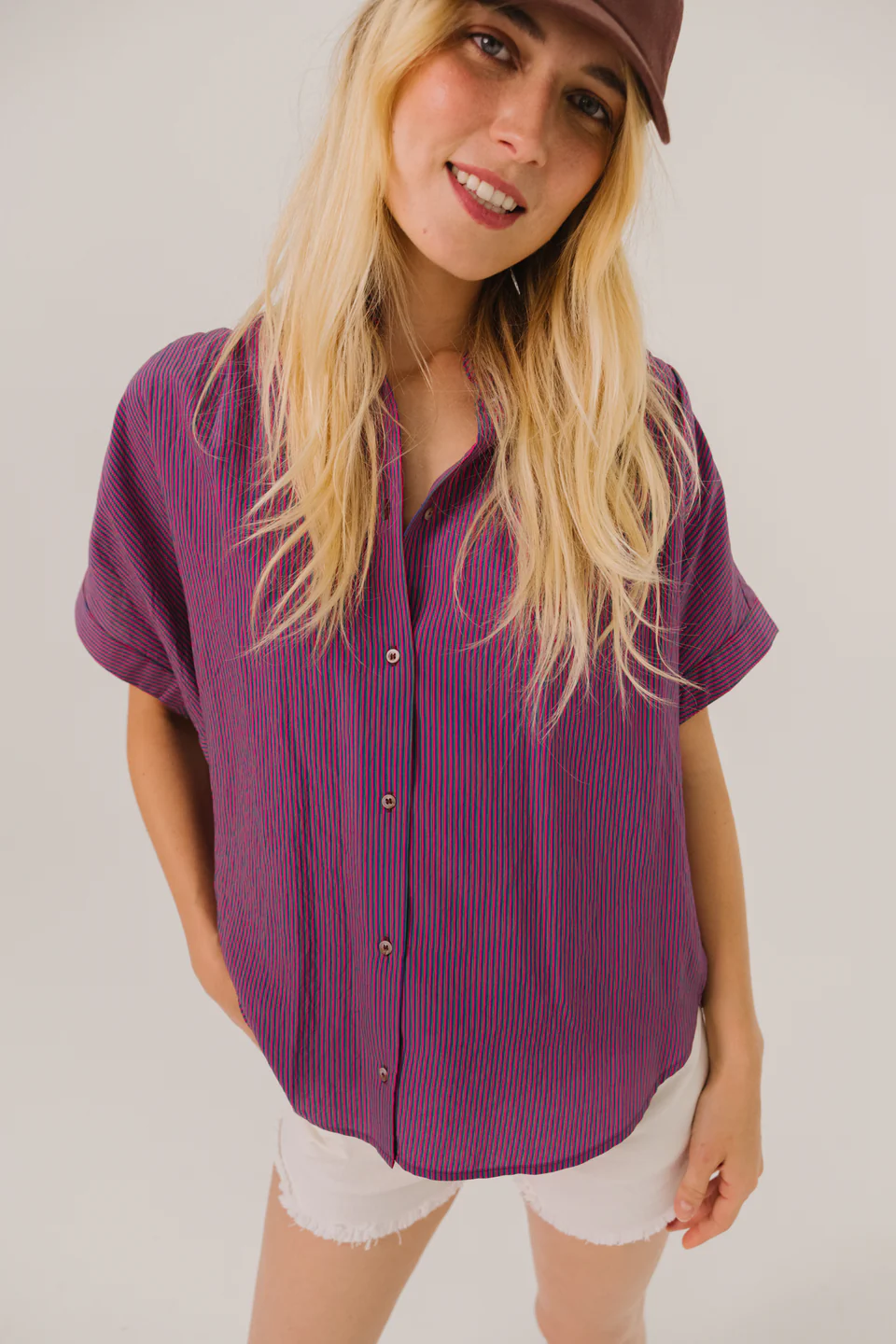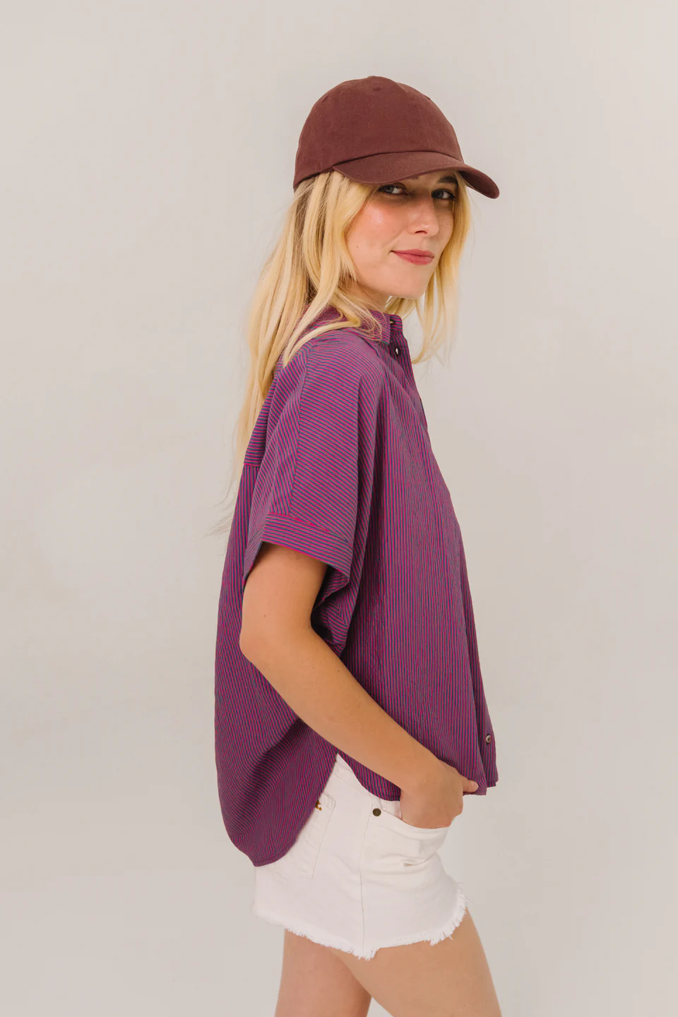 Short-sleeved top with fine stripes. Loose, flowing cut, enhanced with gathers at the shoulders and back for a natural drape. Dropped shoulders, turn-up cuffs, classic shirt collar, and exposed buttons for a touch of timeless elegance.