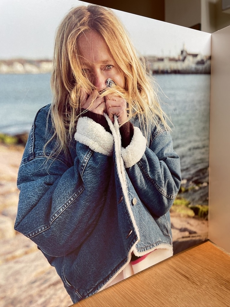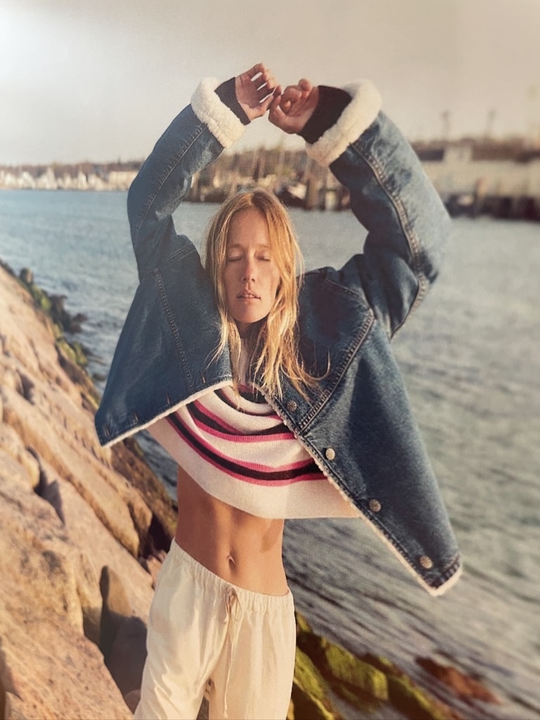 A fun shearling lined denim jacket that is perfectly cropped so it works with dresses and skirts easily. This jacket is fully lined in the faux fur shearling.