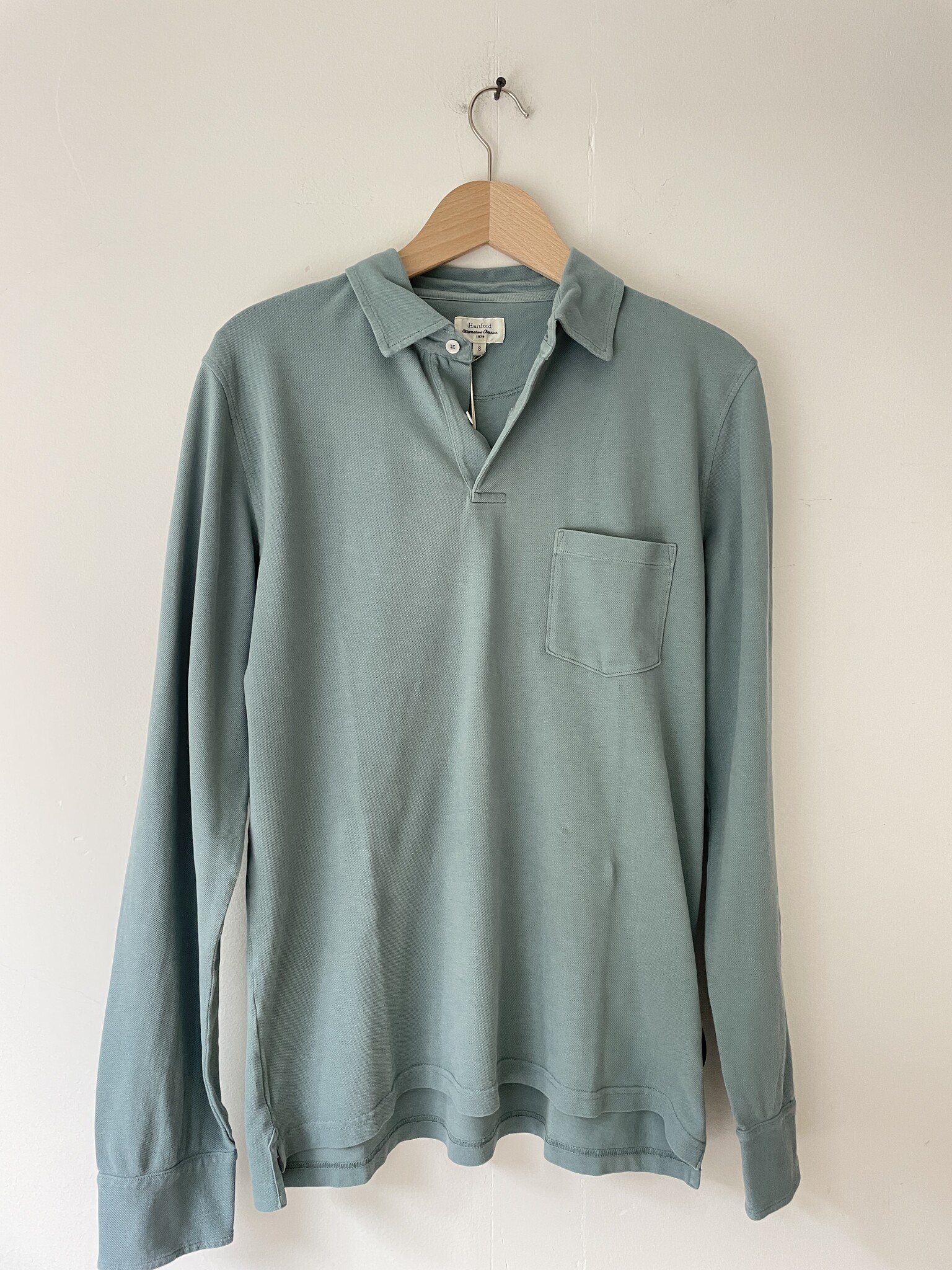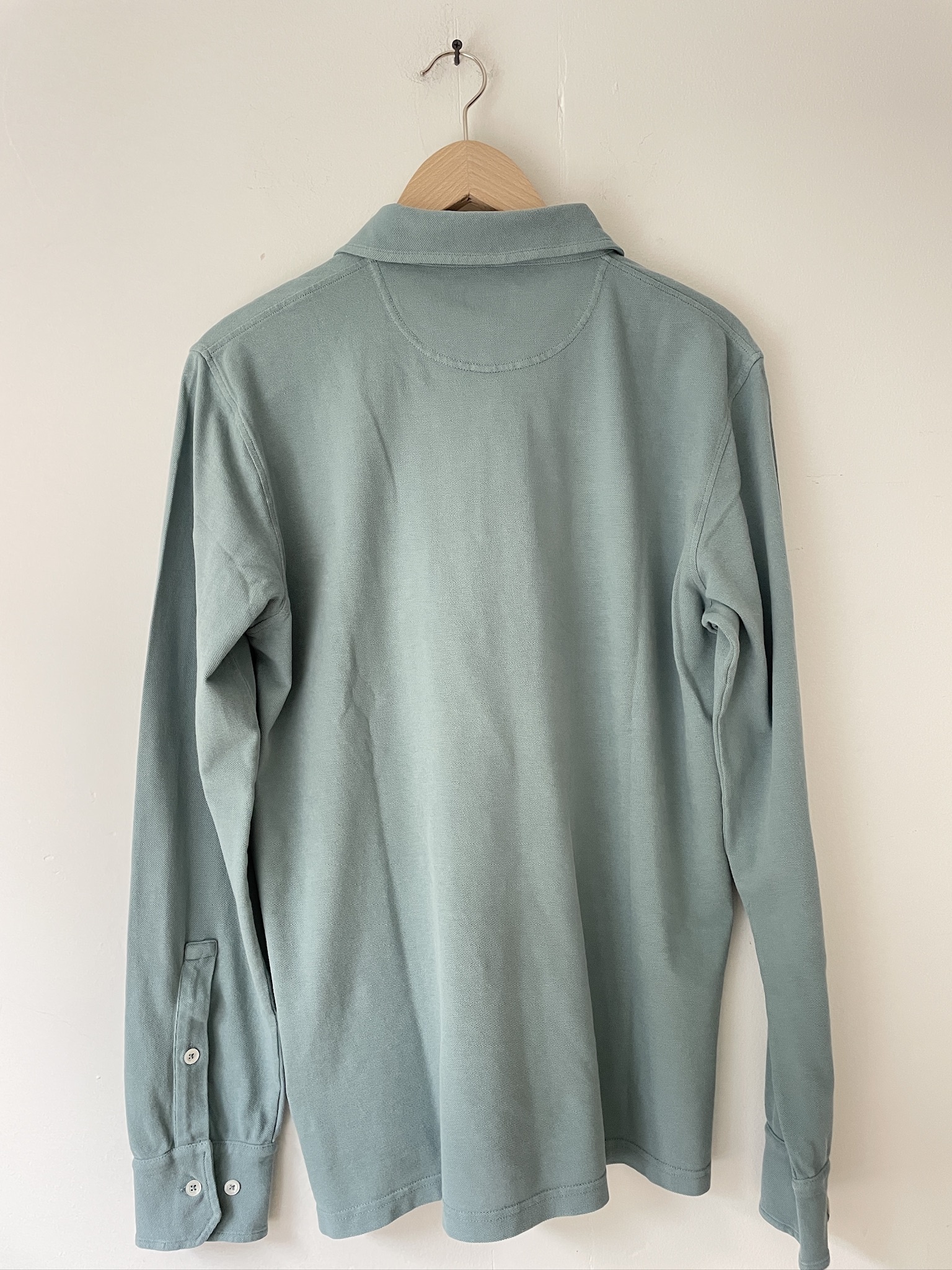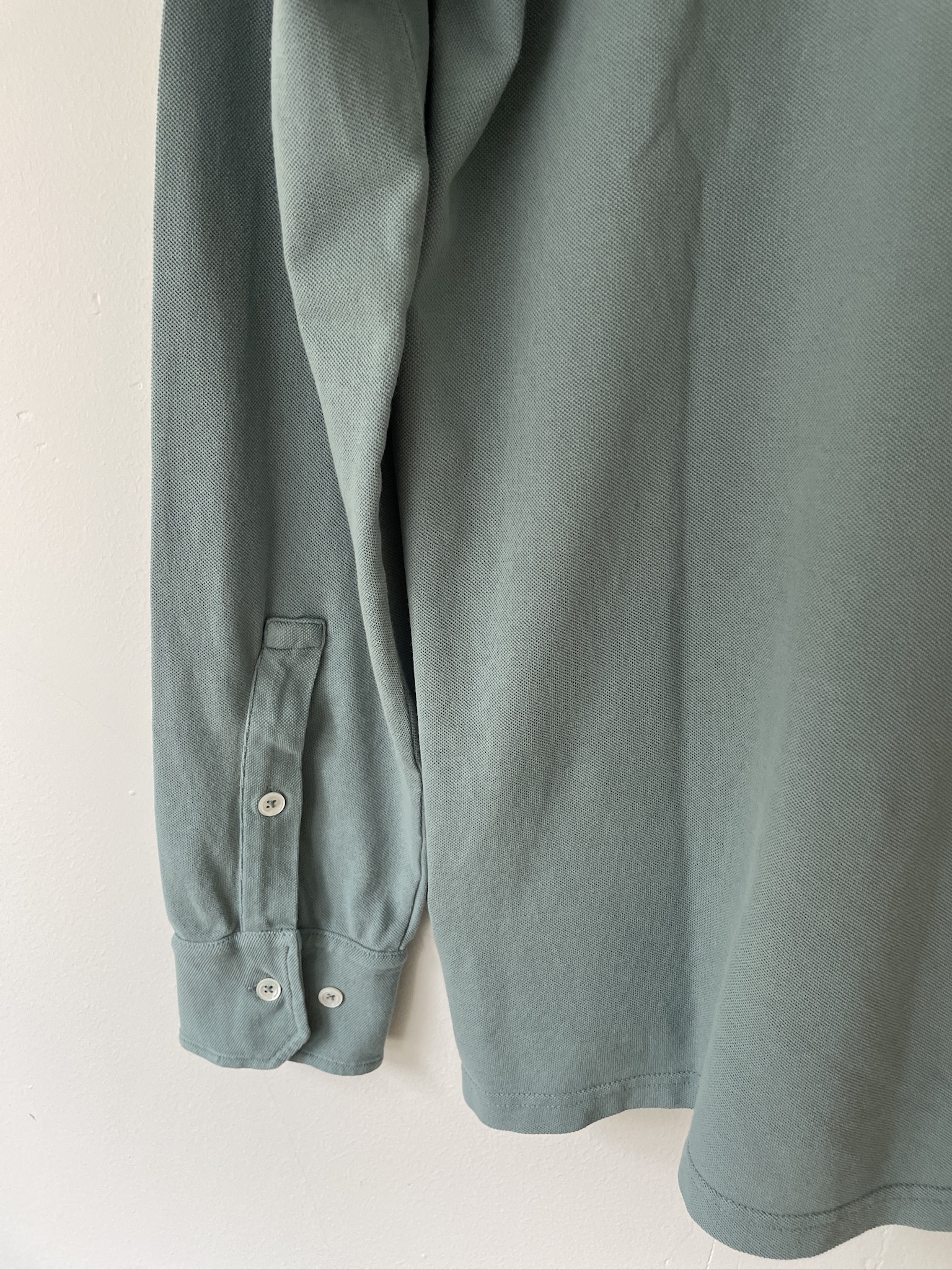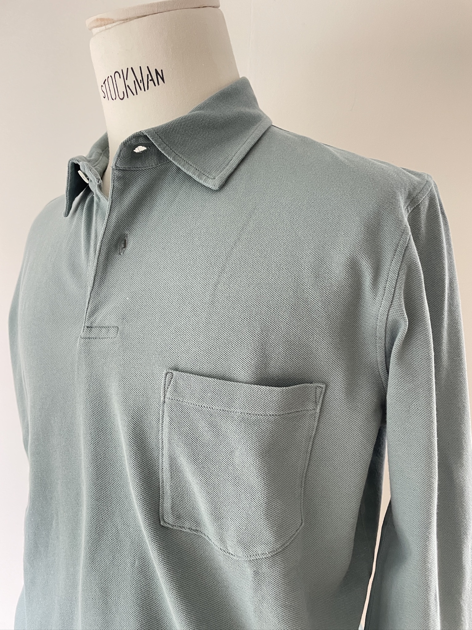 Men's long-sleeved cotton pique polo shirt with two-button collar, chest pocket and adjustable shirt cuffs.