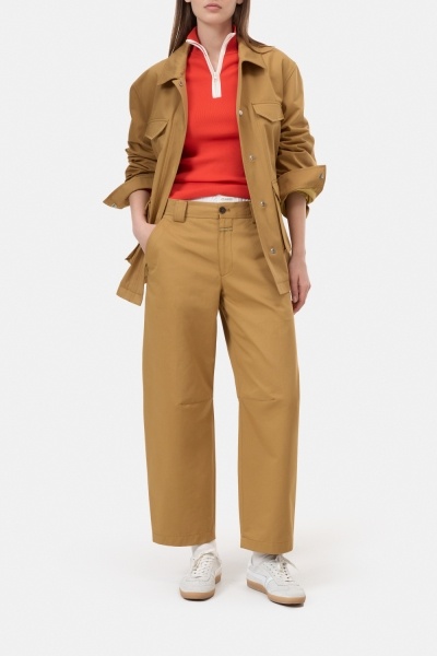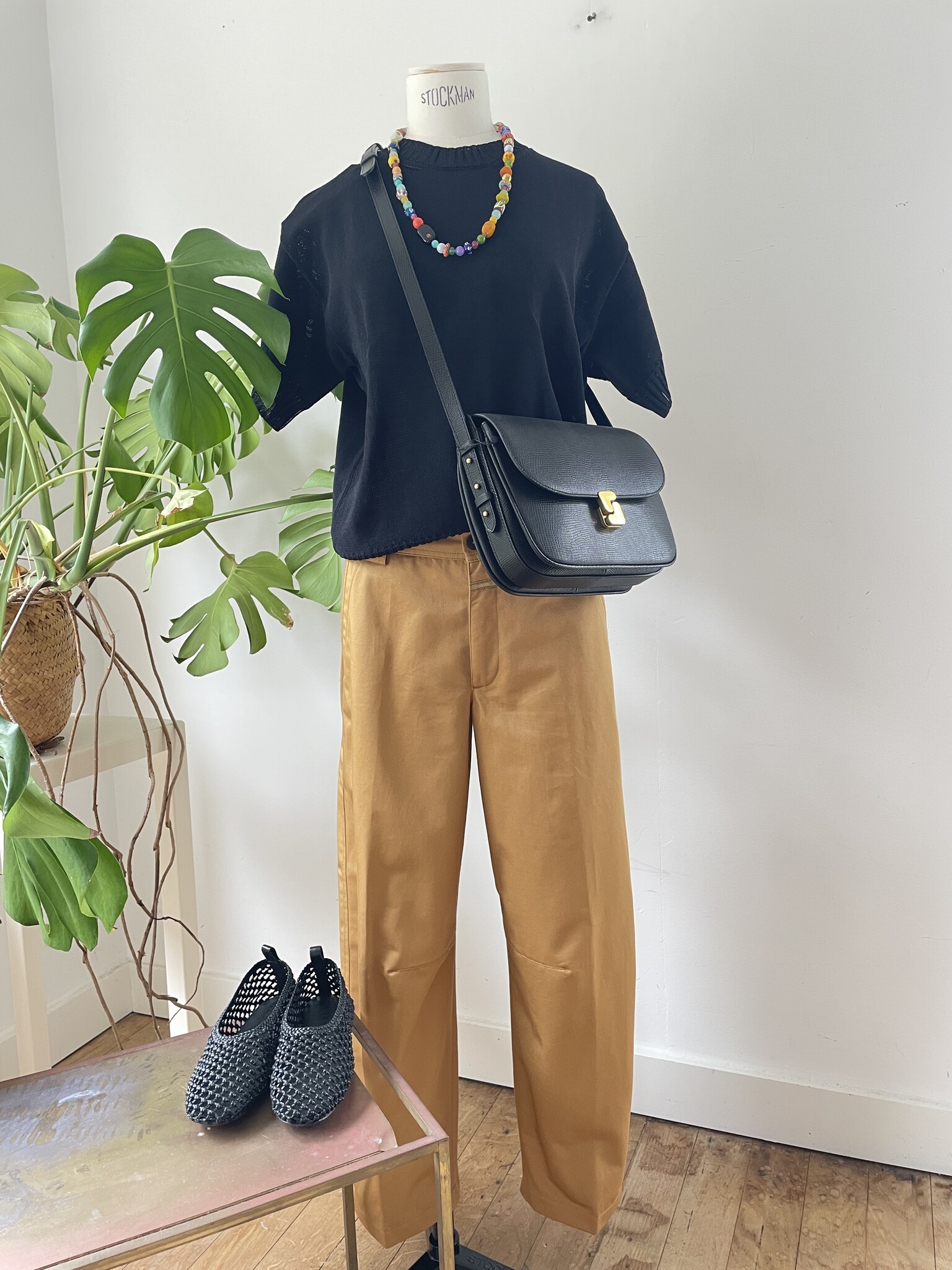 The Romi pants showcase a barrel silhouette with a mid-waist design and cropped length. Crafted from pure cotton with a clean texture, they come with Chino-inspired details such as the buttoned back pockets and wider belt loops.