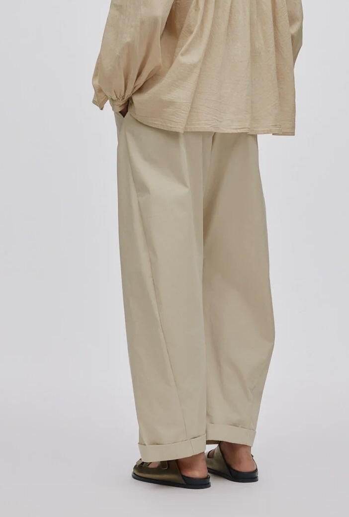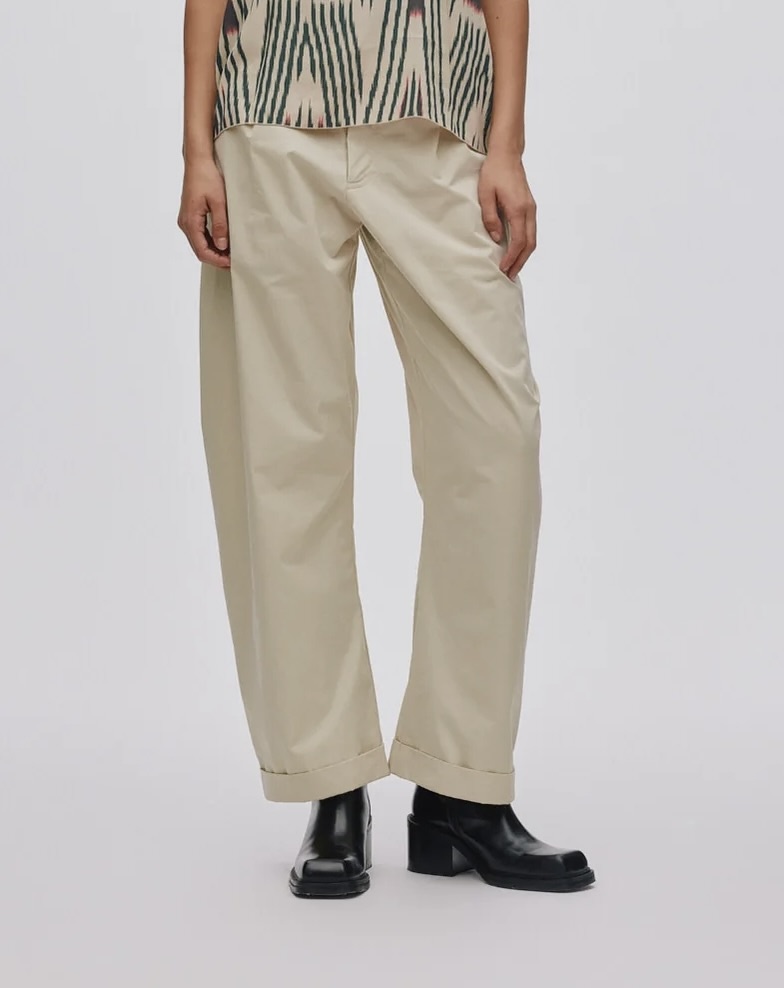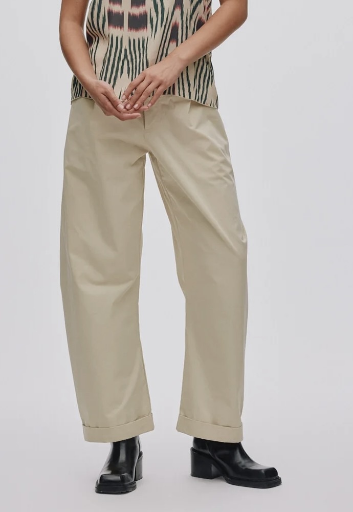 The trousers are made from a comfortable, lightweight material that drapes beautifully on the body. The design is relaxed, featuring a regular waist and loose, straight legs with a cuffed hem. They are detailed with a zip and button closure, side and back pockets, and belt loops.