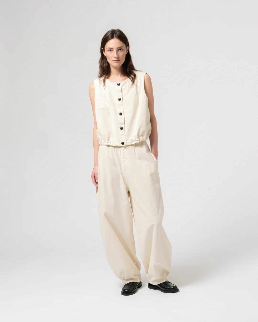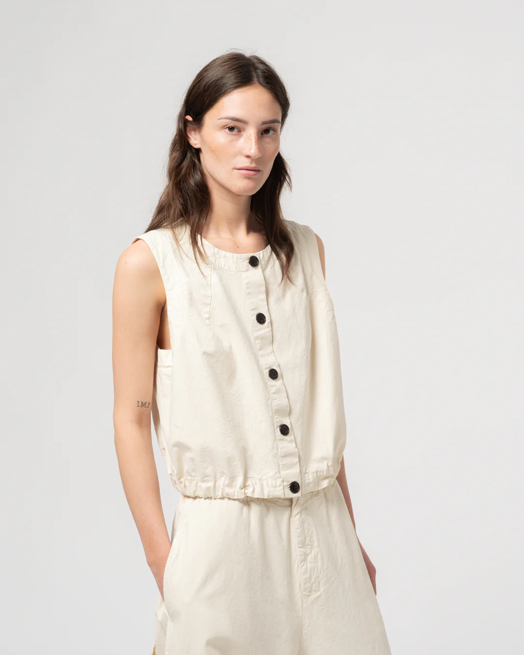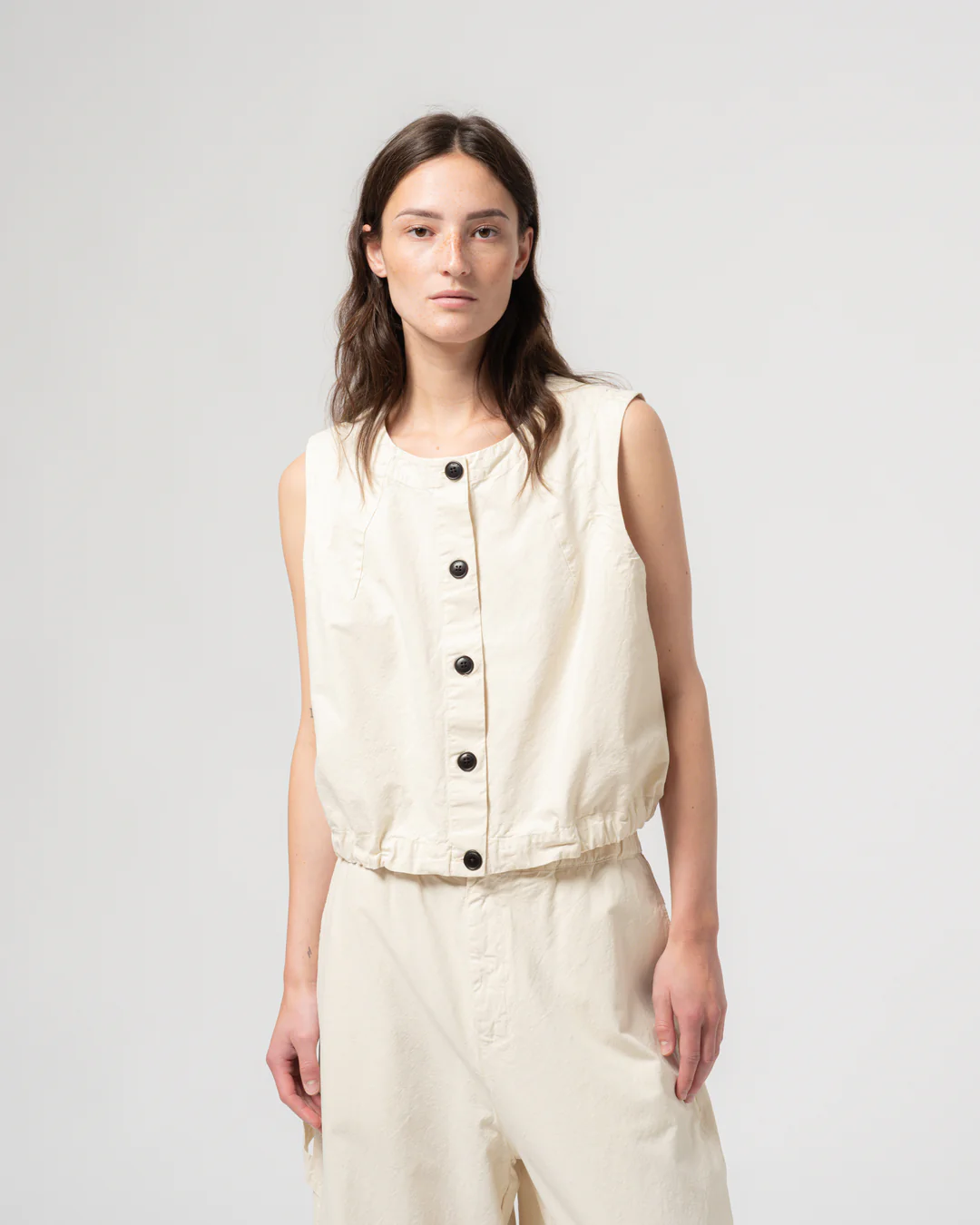 Our Veston is a new cropped vest made from a soft cotton linen blend. Its clean lines and structured fabric create a versatile piece that layers easily or to be worn as a standalone piece.