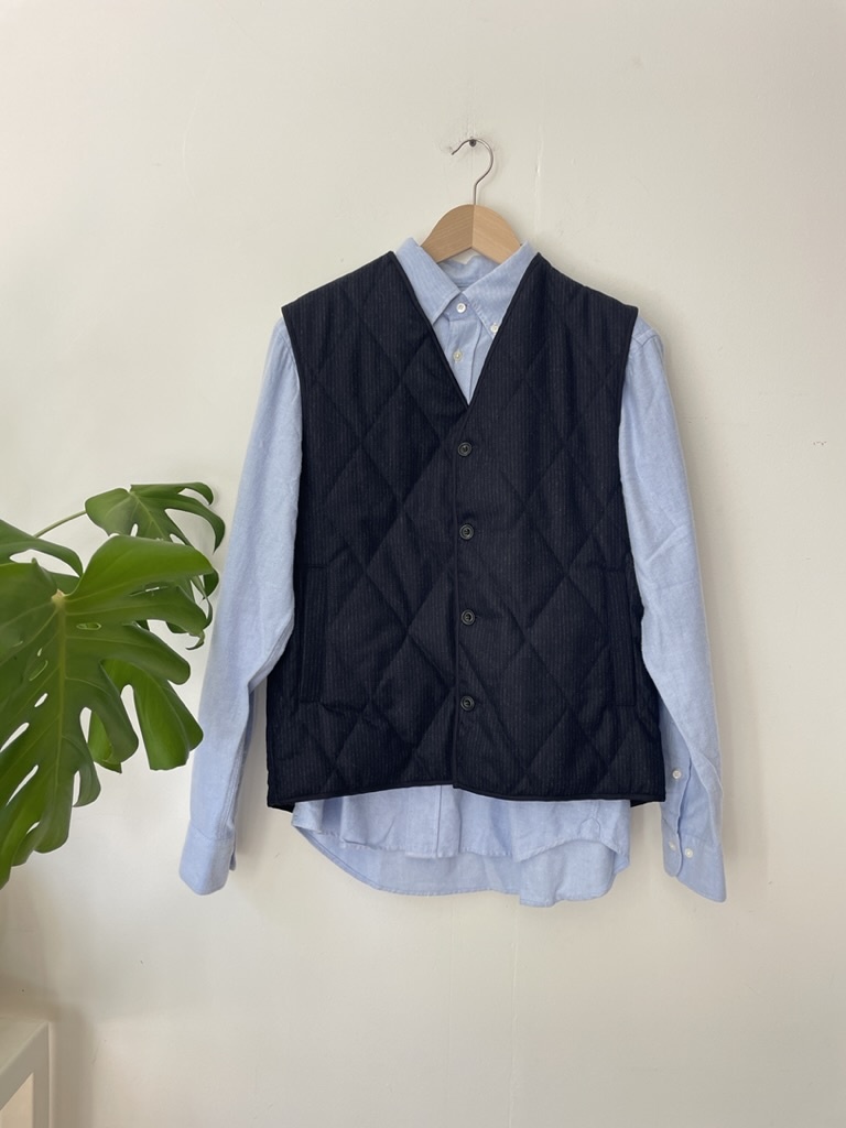 Available in striped recycled wool flannel, the VIC sleeveless cardigan is a highlight of our new collection. Modern and elegant, its quilted interior is particularly comfortable and makes it your mid-season essential. Trendy and comfortable, it can be worn over a sweater or layered under a coat.